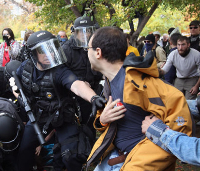 The enemies of the Occupy movement want nothing more than for us to abandon our commitment to nonviolent direct action. They want us to try to defend ourselves from the brutality of the police; they want us to hit back. They want us to break windows and spraypaint grafitti. They need this desperately, for as long as we refuse to fight on their terms, they are powerless to stop us. Only by provoking us to violence can they assume the mantle of “law and order,” tamping down on our “anarchy.”We must not allow the violence and calculated provocation of the security apparatus lure us into retaliation. Police around the country are beginning to shift tactics, and their ultimate goal is to get us to hit back. They know that, if we give into fear by striking back, they can crush us without mercy.