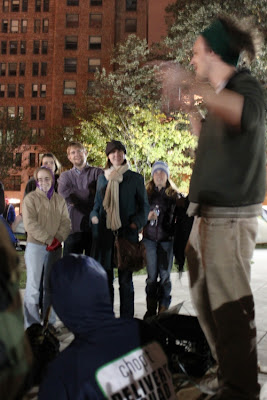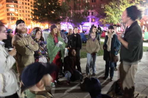 Playing an impromptu concert in McPherson Square is challenging. Jon had no amplification, and was forced to compete with the chaos of police sirens, traffic noise, a nearby drum circle and repeated “mic checked” announcements from other occupiers. It took Jon a while to navigate these obstacles, and the beginning of the set was really hard. By the end, though, Jon was able to capture the mood of the crowd and speak to their hearts in a really beautiful way.