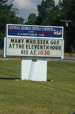 There was a pretty wide range of expressions on these signs, both in length and tone. One simply said, GOD CARES. Another warned that SECRET SINS ARE ONLY SECRET TEMPORARILY. The longest of the messages I saw was triumphal: THE HISTORY OF TOMORROW HAS ALREADY BEEN WRITTEN: EVERY KNEE MUST BOW AT THE NAME OF JESUS.