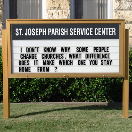 During my morning walk today, I must have passed at least half a dozen church buildings, each one with its own sign facing the road. Most of these were the backlit type with replaceable plexiglass letters that could be rearranged to spell out a new message each week. It was interesting to read each sign as I passed. I felt like it gave me a glimpse into the character of each congregation – or at least of the person who was in charge of updating the message!